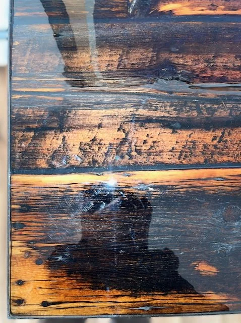 The wood in this table is from the original Burgess family homestead, ca. 1884, and believed to be from one of the barns on the property. The wood remained on site as functioning barn doors until just recently. Worn down over 140 years of sun and use, they are now preserved in layers of epoxy in this table-top.